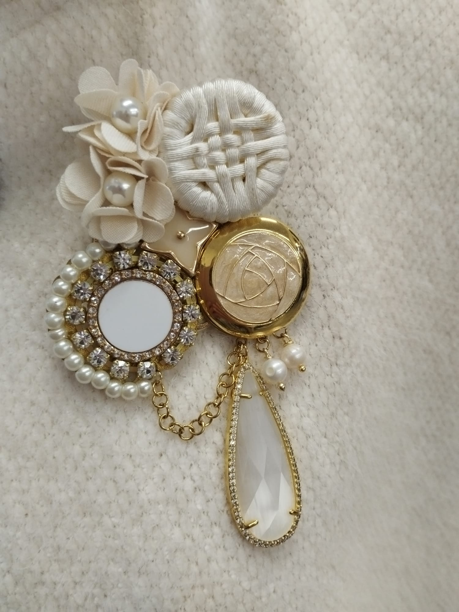 Le spille sono composte da bottoni antichi, perle, strass Swarovski o Preciosa